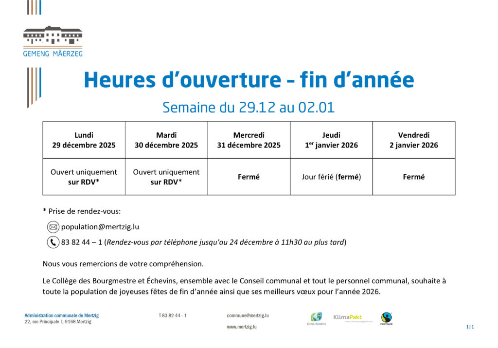 Pour la prise de rendez-vous, nous vous prions de bien vouloir envoyer un e-mail à population@mertzig.lu ou de contacter le 83 82 44 – 1 (prise de rendez-vous par téléphone possible jusqu’au 24 décembre à 11h30 au plus tard).